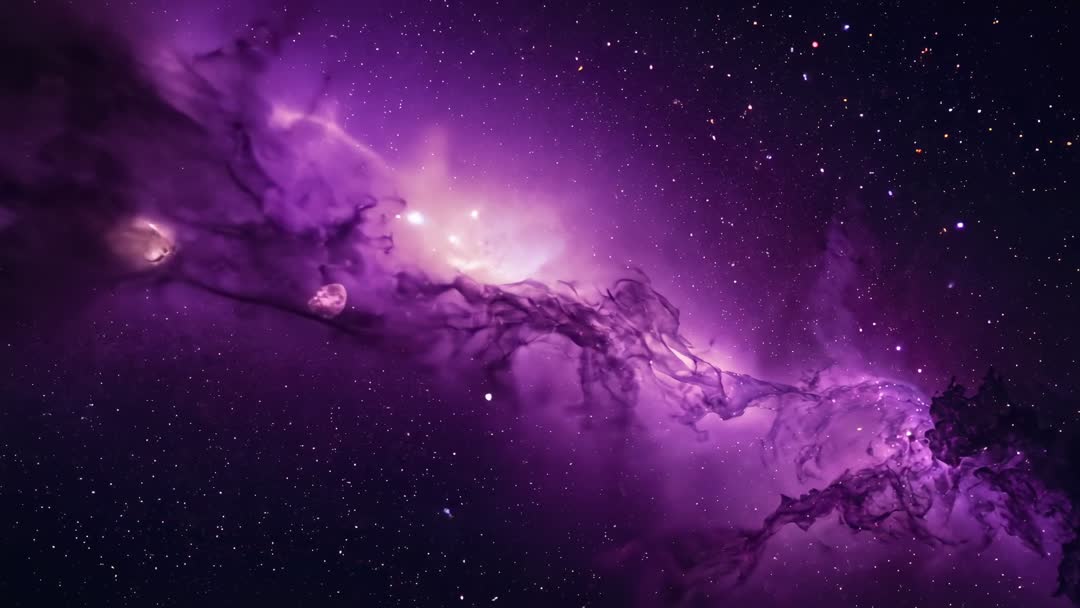 - Panning camera revealing violet nebula core with flowing filaments and luminous starfield