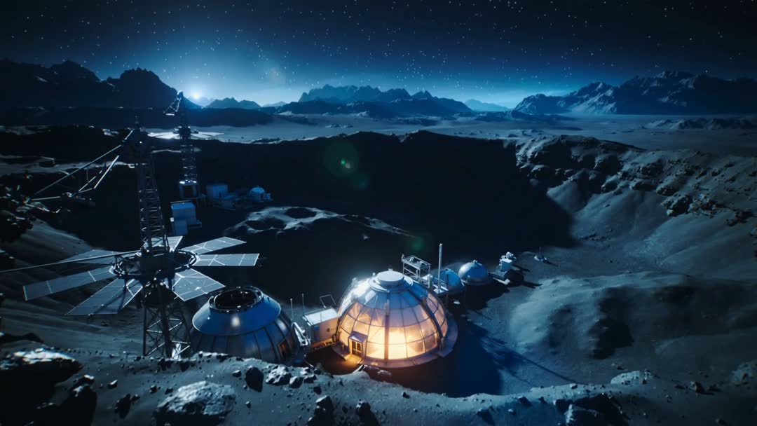 AI Generated Image. Panning across crater rim, camera surveying moon base cluster under dense starfield and distant mountain silhouettes. Lit dome casting warm glow across habitat modules while solar tower and panel array extend into night sky. Scene conveying isolation, scientific exploration, and human ingenuity on hostile world. Useful for cinematic opener, sci-fi trailer, game cinematic, editorial feature on space colonization, classroom presentation, or advertising for space technology concepts. Suggested treatments: combine with slow ambient soundtrack and subtle mechanical ambience, add lens flares and light bloom for cinematic punch, apply dramatic color grade for high contrast, or crop for wide hero banner and fullscreen video background.