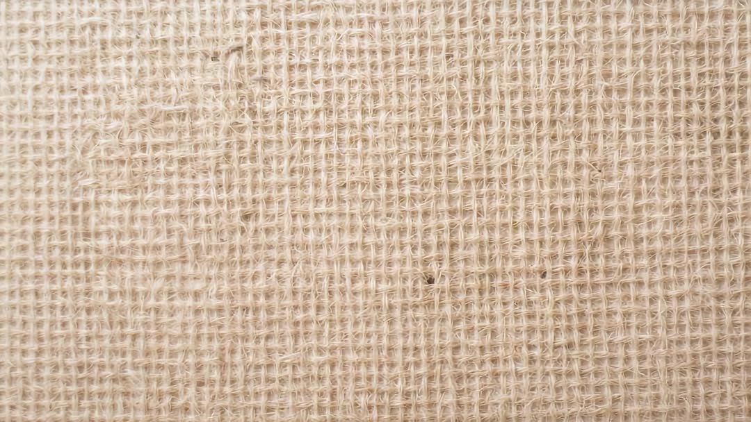 - Panning close-up of burlap weave revealing textured jute fibers and loose lint