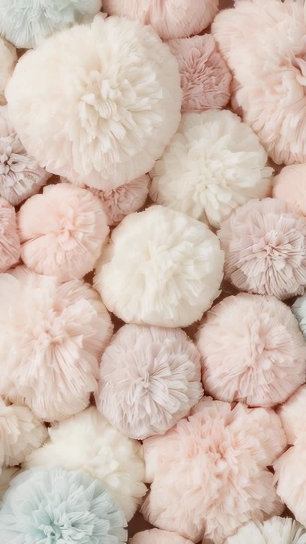 AI Generated Video. Vertical video panning across cluster of pastel yarn pom-poms, revealing soft fibers, layered ruffled shapes, and tactile texture. Gentle camera movement creating calming, cozy mood and emphasizing color gradation in blush, cream, pale peach, and mint tones. Tight framing and macro detail highlighting stitch work and fluffiness for tactile appeal. Serving as social media vertical background, Instagram Story or TikTok clip, craft tutorial opener, product backdrop for handmade goods, or mood footage for wedding and nursery promotions. Loopable edit-friendly for seamless background playback. Recommended use: overlay bold headline or logo in top or bottom safe area, pair with soft acoustic or ambient soundtrack, and adjust speed for slow-motion calming effect.