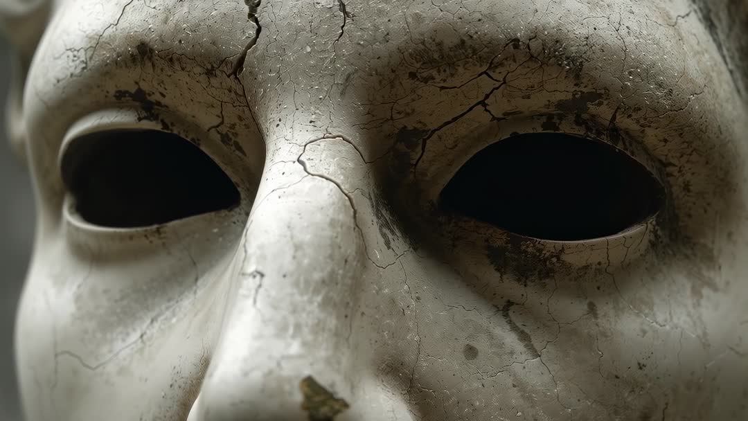 AI Generated Image. Panning close-up revealing weathered sculpted head with cracked surface and hollow eyes, filmed under soft gallery light. Highlighting texture, patina, and surface damage for use in art history footage, restoration documentation, or museum promotion. Evoking eerie, contemplative mood for documentary sequences, horror trailers, or atmospheric title sequences. Supplying high-contrast detail for use as background plate in motion graphics, book covers, editorial layouts, or social media campaigns. Offering clip-friendly framing for color grading, VFX insertion, or before-and-after restoration comparisons. Including metadata tags for stock licensing, archival projects, and creative storytelling.