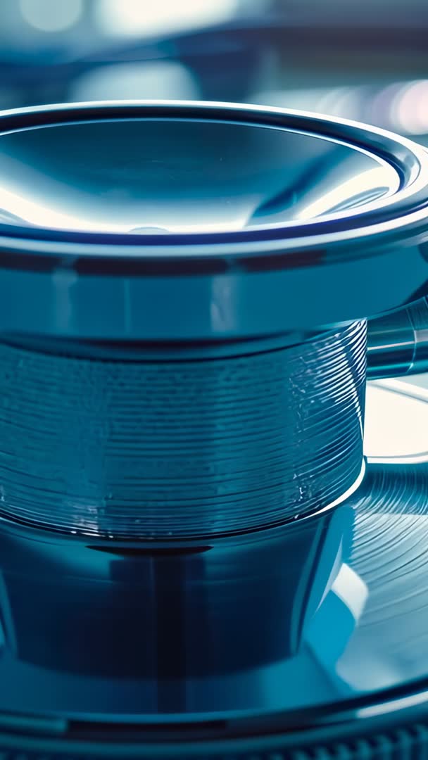 AI Generated Image. Panning across stethoscope diaphragm resting on exam tray, macro closeup highlighting reflective metallic textures and smooth curvature. Shallow depth of field creating soft bokeh highlights and cool blue tone conveying clinical professionalism. Offering 9:16 vertical format, macro detail and high-resolution capture tailored for mobile-first platforms. Footage working well as opener for healthcare promotional videos, telemedicine app intros, medical equipment catalogs, educational modules on auscultation and cardiology. Clip doubling as background for social media vertical ads, mobile landing pages, hospital website hero visuals and conference presentation b-roll. Suggested edits include slowing motion for dramatic reveal, adding subtle ambient music, applying color grade for warmer or cooler mood, and overlaying text for product specs or appointment call-to-action.