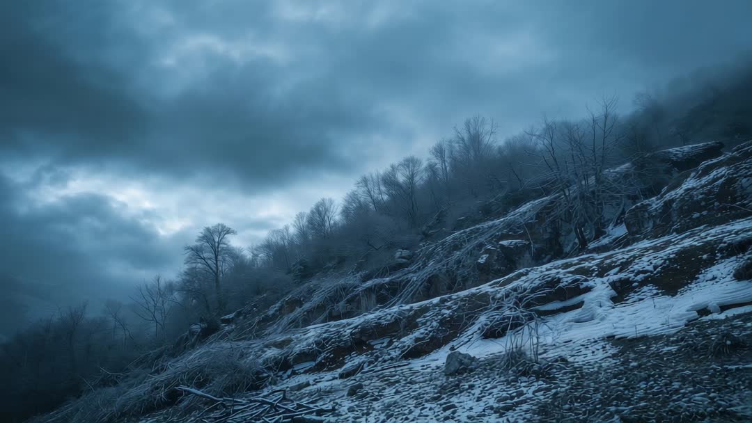 AI Generated Video. Panning camera revealing snow-dusted rocky hillside rising diagonally across frame, thin leafless trees clinging to bare bedrock, low mist drifting along slope under brooding cloud. Blue-gray color palette creating cold, moody atmosphere, suited for cinematic opener, thriller sequence, environmental documentary, or nature montage. Slow smooth movement providing sense of isolation and approaching storm, ideal for title background, social media reel, website hero banner, seasonal campaign, or broadcast opener. Editing tips: adding subtle wind sound, low-frequency ambient pad, gentle color grade boost, or cinematic letterbox crop to enhance drama. Recommended uses: commercial or editorial projects focusing on winter landscape, weather alerts, outdoor gear advertising, travel storytelling, or atmospheric backgrounds for presentations and websites.