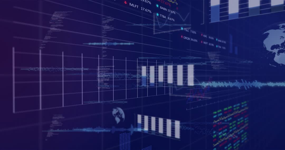 Showing camera panning right across finance dashboard, revealing bar cluster and rising line demonstrating market momentum and price action. Featuring layered parallax panels, grid overlays, globe element, and scrolling ticker with color-coded data and small code-style readouts. Serving corporate finance presentations, broadcast intros, fintech product demos, investor reports, market analysis videos, website hero backgrounds, social media promos, and pitch decks. Allowing editors to crop, loop, color grade, and add custom branding, lower-thirds, or headline overlays. Providing clean space for text callouts, logos, and animated charts. Optimizing for full-screen playback, motion graphics templates, and news-style transitions to enhance storytelling about markets, trading, and financial data.