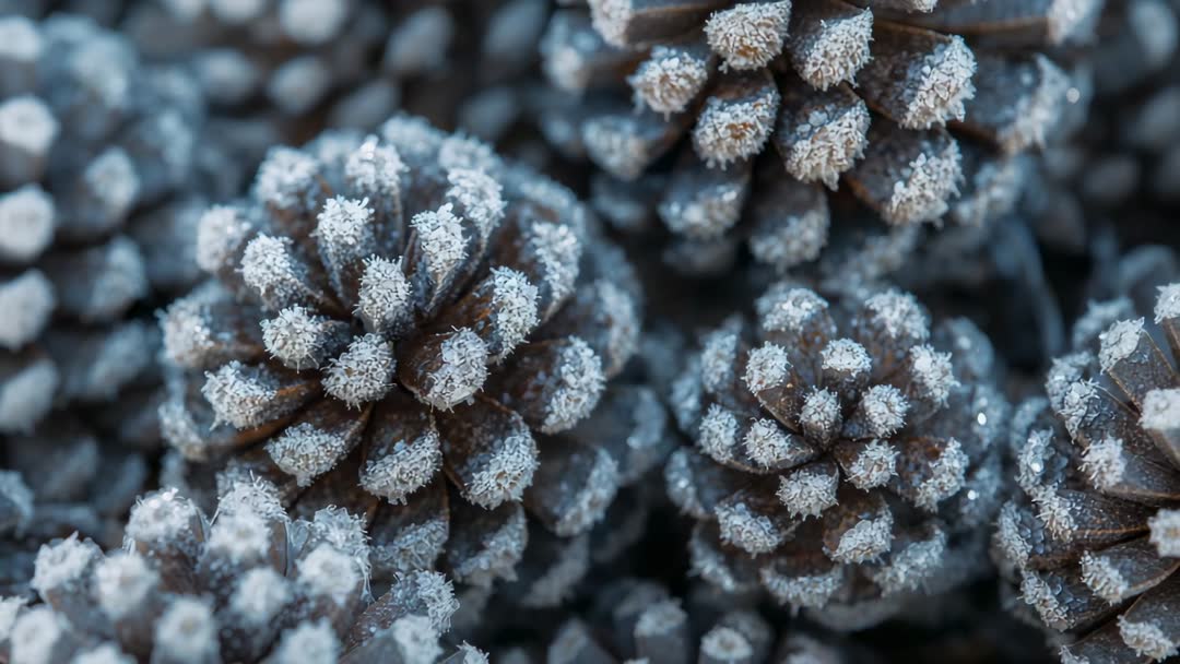AI Generated Video. Showing cinematic panning camera gently shifting focus across frosted pine cones in macro, revealing intricate frost crystal formations and layered cone scales. Capturing cool blue tones and shallow depth of field to emphasize texture, pattern, and delicate winter details. Working well for nature sequences, seasonal promos, holiday openers, background loops, product packaging visuals, and website hero sections. Pairing with ambient music or soft narration for documentary scenes, social media reels, or relaxation and mindfulness content. Providing tight texture shots for graphic overlays, print backgrounds, and mood-setting B-roll in winter advertising and editorial projects.