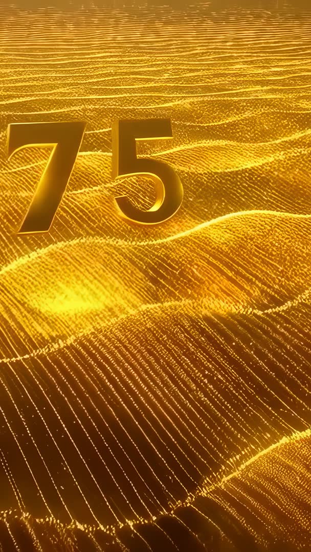 AI Generated Image. Vertical video clip showing panning camera moving closer over shimmering gold wireframe waves. Large floating 75 hologram reflecting light across mesh surface while luminescent pulses are traveling along wave crests. Smooth gradient highlights and metallic sheen are creating premium, futuristic mood with ample negative space for overlays. Clip is providing loopable motion and steady rhythm, suited for countdowns, anniversary milestones, luxury product launches, promotional reels, mobile ads, and event openers. Recommended use cases: Instagram Stories, TikTok ads, vertical landing pages, title sequences, social media banners, and background for branded messages. Suggested edits: overlay bold text or logo in empty areas, add subtle audio punch for pulses, adjust color grading for brand match.