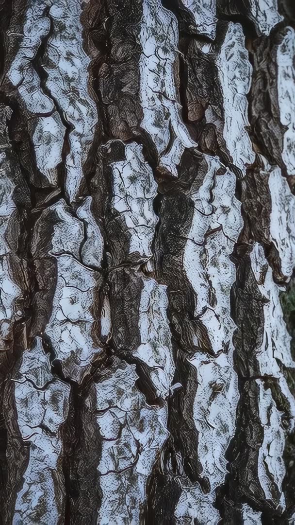 AI Generated Video. Vertical macro clip panning along weathered pine bark, showing deep fissures, flaky lichen, and patches of moss. High-contrast textures and rhythmic ridges creating abstract natural pattern for backgrounds, title reveals, or ambient nature montages. Suited for environmental documentaries, outdoor travel promos, forestry or woodcraft presentations, and design projects needing organic textures. Recommending looping for ambient background, slowing speed for dramatic close-up, or pairing with forest soundscape for immersive effect. Filming in portrait orientation, optimizing clip for social media reels, stories, and vertical video campaigns.
