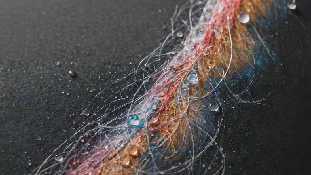 AI Generated Image. Video showing panning camera moving along colorful braided fiber strand on dark textured board. Macro composition revealing droplets clinging to glossy threads and loose microfibers fanning outward. Lighting accentuating iridescent blue, pink, and warm gold tones, creating abstract ribbon of color against muted backdrop. Motion delivering cinematic reveal while shallow depth of field isolating fine detail and surface texture. Suitable for textile design presentations, craft tutorials, product packaging mockups, beauty and cosmetic advertising, editorial features on materials science, and social media motion backgrounds. Clip working well as loopable background for motion graphics, transitional overlay in promotional videos, or close-up insert in documentary and commercial shoots. Frame providing high-resolution stills for print use such as magazine spreads, marketing collateral, and fine art prints.