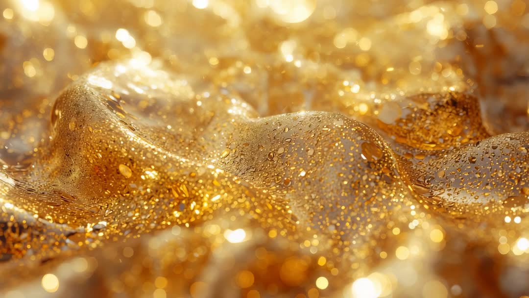 AI Generated Image. Video showing panning macro of rippling golden gel studded with glittery metal flakes and droplets. Shallow depth of field creating soft bokeh highlights and warm golden tones. Surface texture appearing tactile with viscous globs, translucent layers, and reflective specular highlights. Footage suiting luxury branding, beauty product promo, cosmetic packaging, motion graphics overlay, website hero header, social media teaser, and editorial visuals. Looping-friendly segments offering smooth continuous motion for background loops and transitions. Color grading optimizing warm metallic palette for high-end advertising and mood-driven scenes. Useful for designers needing abstract texture, packagers wanting luxurious accents, editors crafting cinematic promos, and marketers building premium product narratives.
