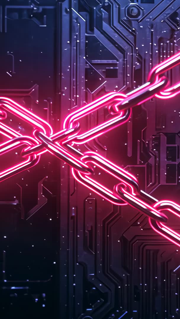 AI Generated Video. Vertical cyberpunk video panning across neon pink chains draped over dark circuit board, with fine digital dust particles catching light around each link. High-contrast neon illumination and deep shadows creating dramatic techno mood suitable for futuristic themes. Ideal for opening sequences, social media stories, mobile ads, music visualizers, tech product promos. Suggestions for use: pairing with synthwave or electronic soundtracks; overlaying bold headline and logo in upper or lower thirds; looping clip for background during live streams or virtual events; using as wallpaper or screen saver for mobile devices. Editable color and glow settings allowing brand customization and seamless integration into motion graphics projects.