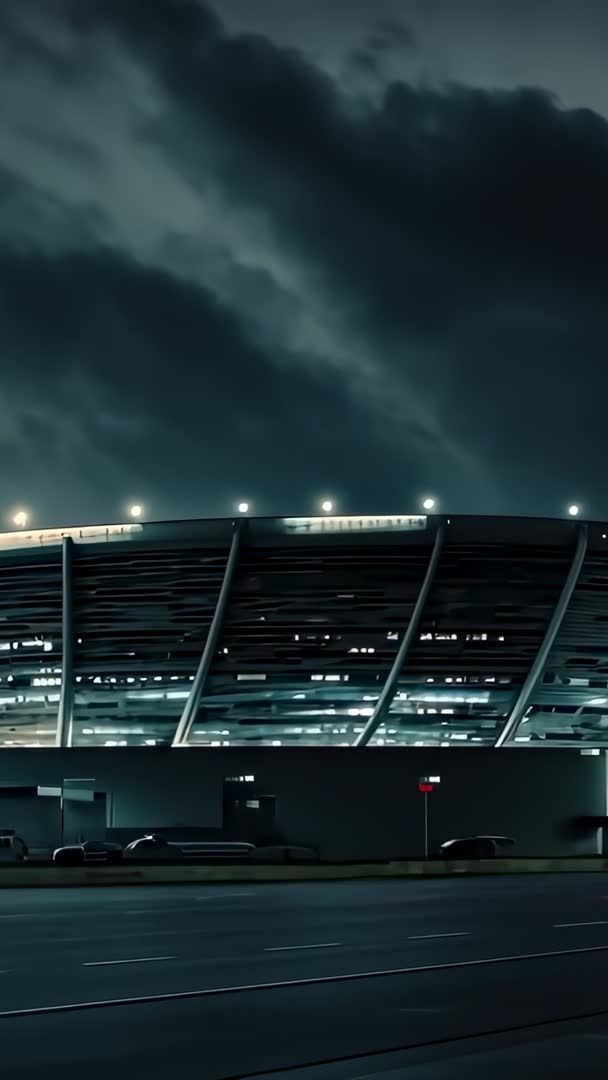 AI Generated Image. Showing exterior of modern stadium at night, camera panning across curved illuminated facade while heavy storm clouds build overhead and vehicle taillights streak along foreground road. Emphasizing vertical composition, dramatic lighting contrasts, and repetitive structural beams for strong graphic impact. Ideal for cinematic openers, title sequences, broadcast bumpers, sports marketing, architecture showcases, weather forecast segments, and urban lifestyle promotions. Captured in vertical format, optimized for mobile platforms such as Instagram Reels, TikTok, and vertical ads. Postproduction tips: push teal-cyan grade for moody atmosphere, enhance contrast on beams for visual rhythm, extend taillight trails for dynamic lower-third or text placement, and add subtle ambient sound design for immersive trailer or promo use.
