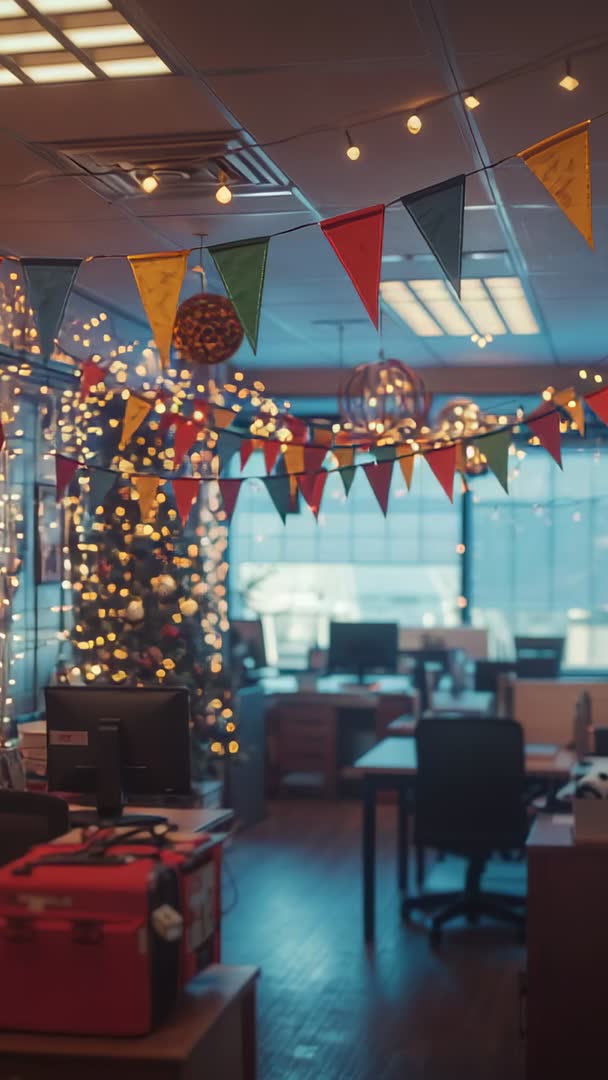 AI Generated Image. Vertical video panning across office pennant banners, string lights, Christmas tree, creating warm festive atmosphere. Perfect for social media Reels, TikTok, Instagram Stories, LinkedIn holiday posts promoting company culture and seasonal events. Suitable for internal communications, event invitations, retail promotions, website hero loops. Recommending looping 6 to 30 seconds for short-form content, trimming start and end for smooth transitions. Suggesting pairing with upbeat instrumental music, soft jingle, ambient office sounds to enhance mood. Leaving central area free for overlay text, logo, lower third messaging; avoiding placing important elements near top or bottom edges. Color grading toward warm tones to emphasize twinkle lights and cozy feel; adding subtle camera motion or parallax for depth. Ideal for brand holiday greetings, internal culture reels, event promo teasers, background for virtual holiday meetups. Providing specs: 9:16 aspect ratio, 1080x1920 for HD or 2160x3840 for 4K vertical. Providing searchable keywords for SEO and licensing considerations.