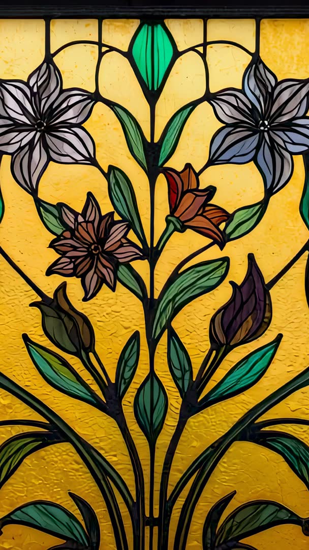 AI Generated Image. Vertical video clip showing panning camera recentering on backlit stained glass panel with floral motif and symmetrical leadwork. Featuring warm amber backlight, vibrant green leaves, purple and blue blossoms, textured glass and bold black leadlines creating graphic mosaic effect. Clip working well for interior design reels, architecture documentaries, craft restoration promos, museum exhibit loops, church visual displays, and social media storytelling. Use clip as hero background with subtle overlay text, loopable B-roll for transitions, close-up detail shot for decorative pattern study, or still frame for print and poster art. Suitable for licensing in advertising, editorial features on artisanal glasswork, hospitality design, and historical architecture projects.