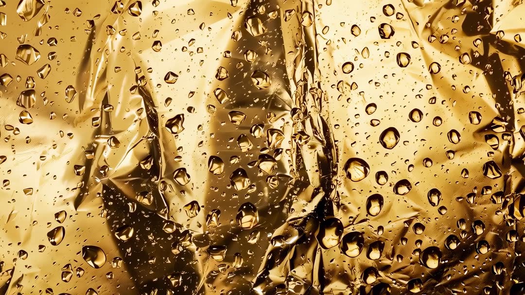 AI Generated Image. Video showing panning over crumpled gold foil with water droplets and vertical crease, capturing macro metallic texture and reflective highlights. Warm golden tones and shallow depth of field creating cinematic shimmer and abstract patterns. Suiting luxury product packaging, cosmetic and jewelry promos, title sequences, looping website backgrounds, social media adverts, and editorial motion pieces. Providing high-detail texture plates for CGI overlays, texture mapping, and graphic design. Supporting mood reels, branding promos, event visuals, and premium packaging mockups. Featuring AI-generated asset label for licensing and metadata. Optimizing for color grading and seamless looping.