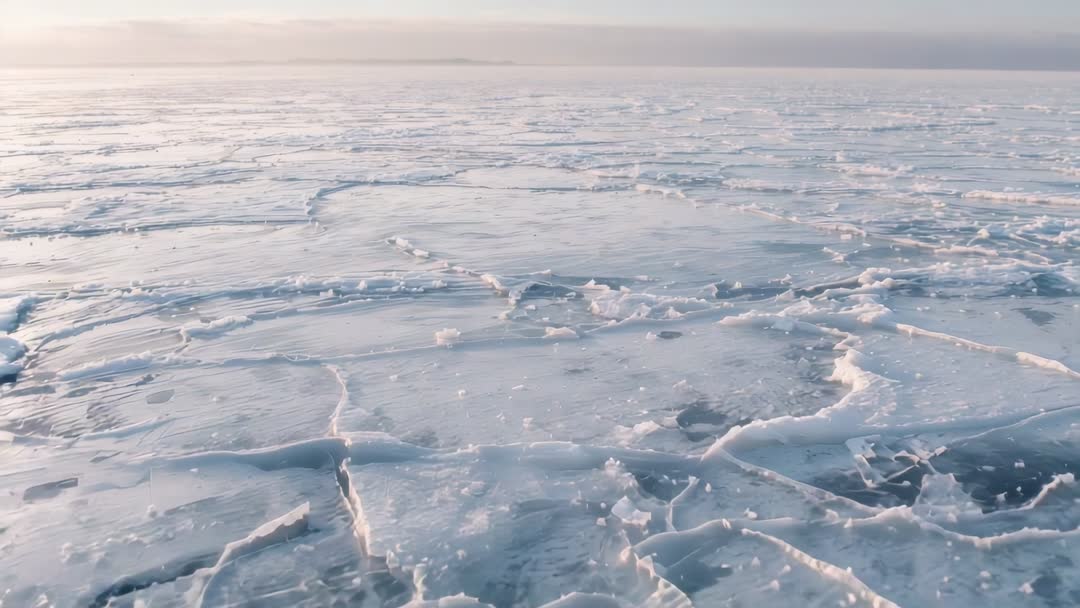 AI Generated Video. Showing slow panning shot over fractured pack ice stretching toward distant horizon, revealing network of cracks, ridges, hummocks, and melt pools. Casting pale sunrise light across textured ice surface, creating cinematic contrast between smooth floes and jagged leads. Serving documentary sequences on polar environment, climate change coverage, scientific presentations, travel films, and atmospheric title backgrounds. Using as establishing shot for Arctic expedition scenes, news packages on sea ice loss, or environmental campaign visuals. Suggesting edits such as subtle color grade to enhance blue tones, slow motion for dramatic emphasis, and wide-screen crop for cinematic framing. Stock-friendly composition leaving room for lower-third text and logo placement.