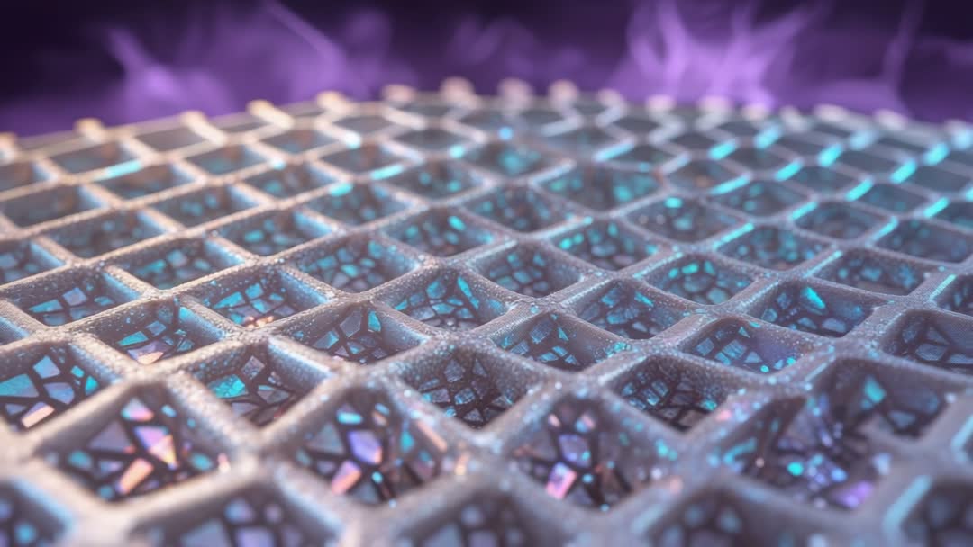 AI Generated Image. This video frame captures a breathtaking CGI scene featuring a panning shot over a lattice grid. The pattern showcases iridescent fragments with a distinct purple glow, creating a mesmerizing and futuristic ambiance. Perfect for illustrating advanced designs in digital art, technology showcasing, or adding an imaginative touch to sci-fi and AI-themed projects.