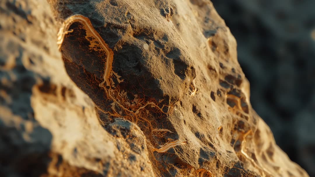 AI Generated Image. Video captures a slow-moving view of complex fibrous tendrils embedded within a textured stone face. These glowing tendrils add an element of the surreal to the naturally rugged surface, highlighting the interaction between natural geological formations and technology-driven textures. Useful for educational videos on geology, digital art backgrounds, and sci-fi film assets, illustrating the fascinating fusion of nature and artificial intelligence-derived features.