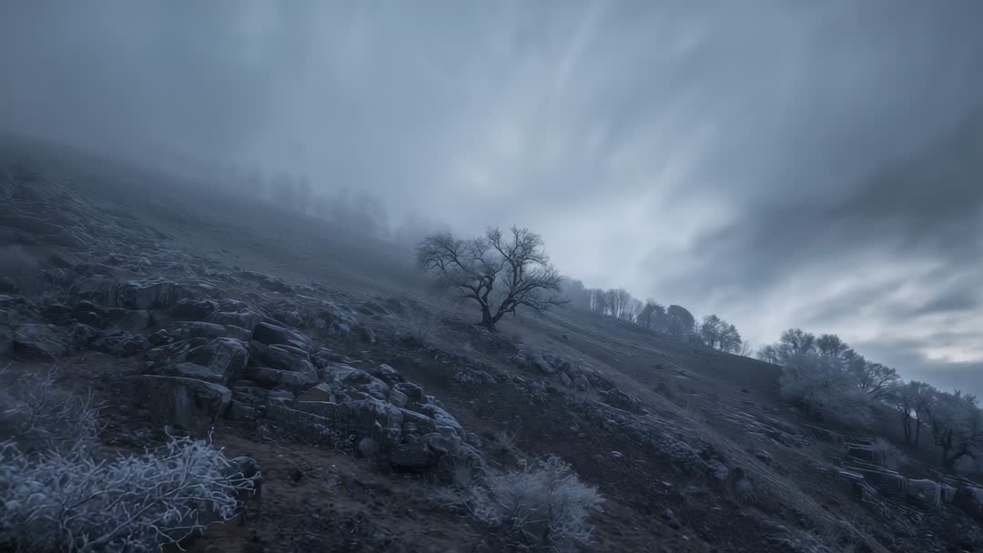 - Panning over lone frosted tree on wind-swept hillside with rolling fog, cinematic dusk