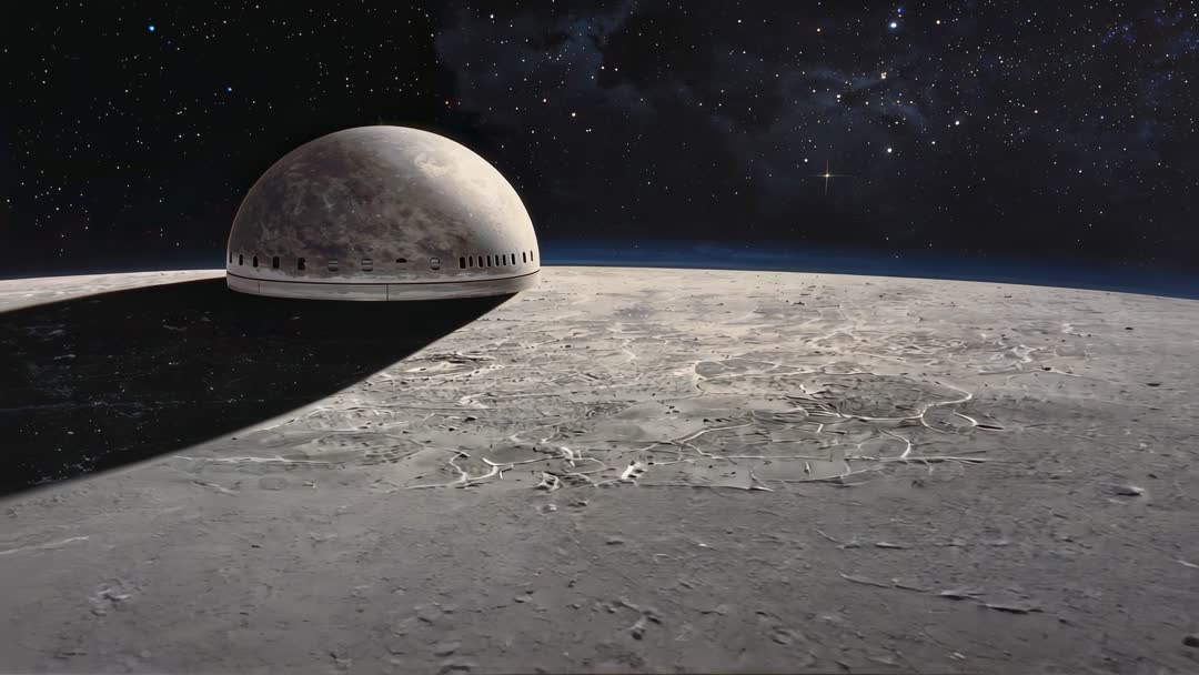 AI Generated Image. Footage showing camera panning over cratered moon surface and pulling away toward horizon, revealing domed structure with vents and port openings casting long shadow across barren plain. Starfield and thin planetary limb adding depth and scale while lighting emphasizing regolith textures and impact patterns. Clip serving as opener for sci fi film sequences, space exploration documentaries, game trailers, or book cover animations. Clip working well as background for headline text, website hero banners, promotional reels, or museum displays. Recommend pairing with slow cinematic music and subtle sound design for dramatic effect. Suggest color grading toward cool desaturated tones for realistic look or warm contrast for stylized cinematic mood. Include safe space near horizon or within shadowed area for overlaying logos or taglines.