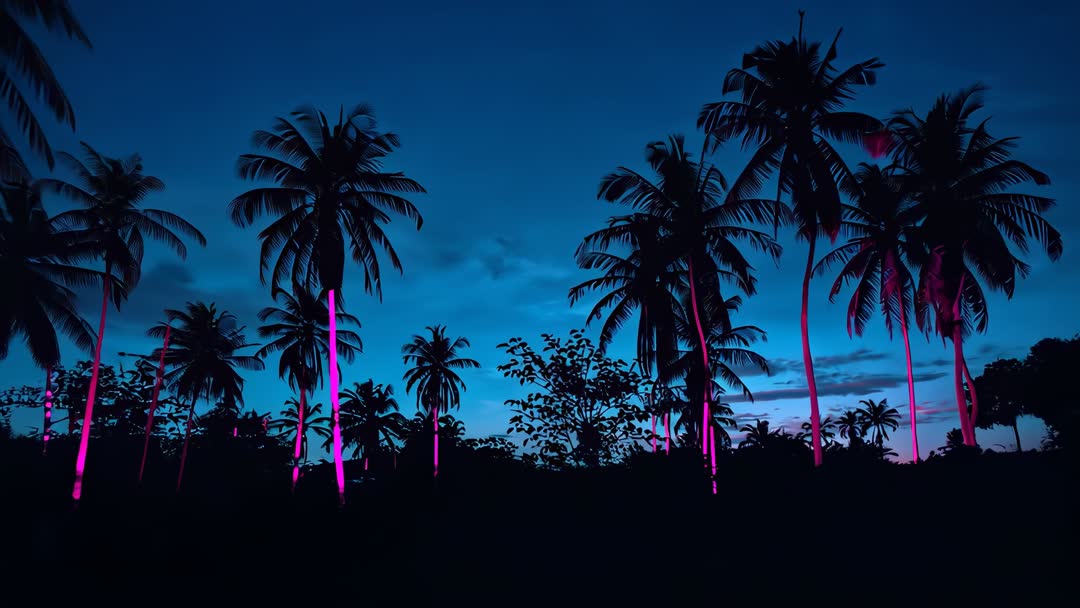AI Generated Video. Panning shot moving right through neon-lit palm grove at twilight, revealing magenta light strips wrapped around trunks. Creating moody cinematic atmosphere with deep blue sky contrasting hot pink accents. Serving as background for music videos, fashion campaigns, nightlife promotions, and technology ads. Offering looping-friendly composition with clear silhouette area for bold typography and logo placement. Pairing with synthwave or tropical house audio to enhance retro-futuristic vibe. Working well in social media headers, website hero banners, editorial spreads, and promotional reels seeking surreal tropical aesthetic.
