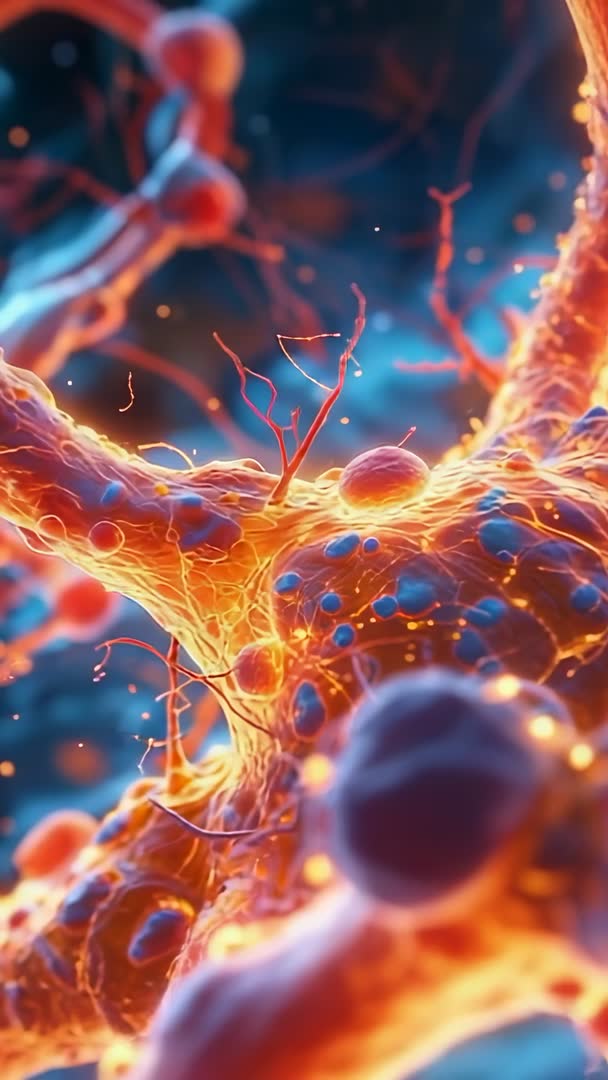 AI Generated Image. Vertical 9:16 video offering dynamic pan through neuron tissue, showcasing synaptic vesicles, vesicle release sites, and branching neurites in high detail. Rich color contrast with warm orange highlights against cool blue background, enhancing depth and focus. Ideal for educational content, neuroscience lectures, medical research promos, biotech brand storytelling, and social media vertical ads. Supporting close-up inserts for textbook animations, e-learning modules, conference openers, website hero banners, and documentary sequences. Enabling easy customization with overlay text, captions, slow motion, and voiceover. Loop-friendly composition for seamless playback in mobile-first projects.