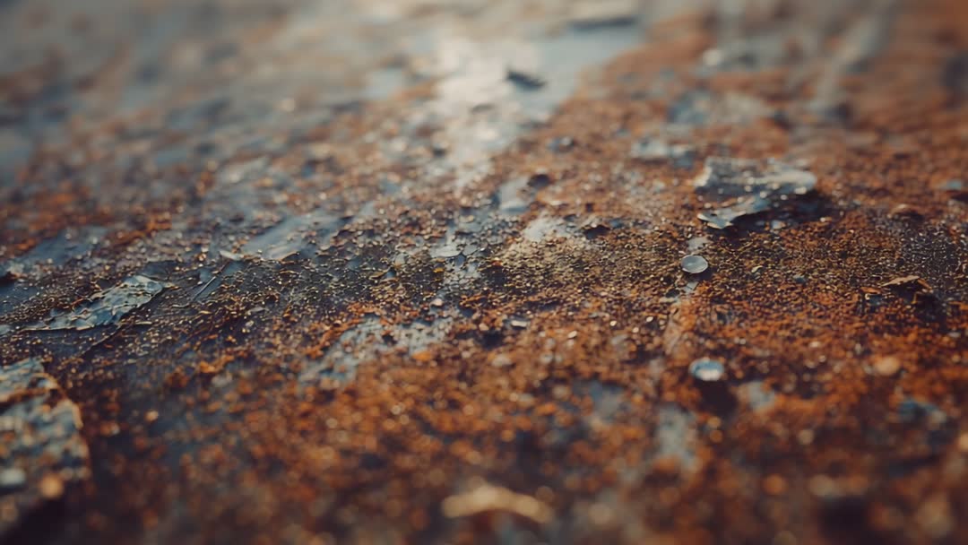 AI Generated Image. The video captures a closeup view of a rusted metal surface panning across fragments of peeling paint and scattered water droplets, emphasizing the effects of time and elements on industrial materials. The grunge aesthetics highlight textures created by corrosion and water, providing a great resource for concepts of aging and decay in projects. Useful for creative projects needing elements of wear and tear, historical documentaries, or design projects focusing on textured backdrops.