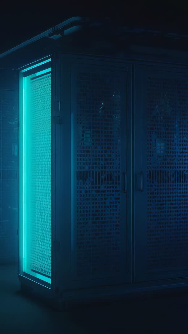 - Panning perforated server rack corner with cyan LED glow in data center vertical video