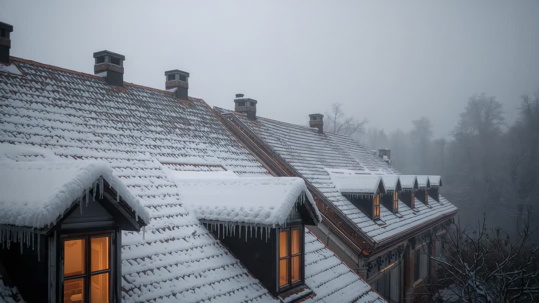 AI Generated Video. Slow panning pullback shot revealing snow-covered rooflines, dormer windows glowing with warm light, and icicles hanging from eaves amid low fog and forest backdrop. Close-up moments showing textured roof tiles, chimney stacks, and thick snow layers creating atmospheric contrast between cold exterior and warm interior. Mood evoking quiet winter evening ideal for holiday, travel, hospitality, and architecture projects. Suggested uses include lodge and resort promos, winter travel guides, seasonal social media reels, broadcast establishing shots, film and TV montages, website hero loops, and editorial features on weather or winter living. Color grading options recommending cool desaturated palette for moody tone or warmer midtones to emphasize interior glow. Consider adding subtle ambient sound design such as wind gusts, gentle roof creaks, and distant forest ambience to enhance cinematic feel. Clip working well for opening sequences, transitions, and background for voiceover narration.