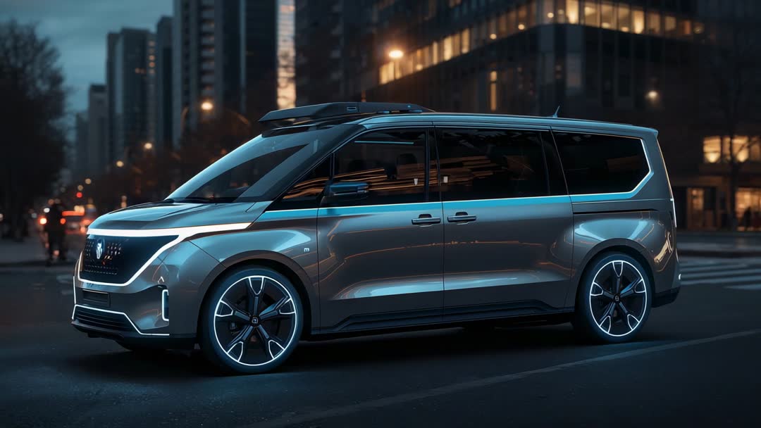 AI Generated Image. Cinematic panning video showcasing electric minivan cruising wet city street at dusk, highlighting LED light signature, alloy wheels, and rooftop cargo box. Moody blue-gray color palette, wet asphalt reflections, and soft city bokeh creating premium urban atmosphere. Ideal for automotive commercials, EV launch campaigns, urban mobility presentations, technology product reels, and lifestyle travel content. Works well as hero banner, opening shot, background loop, or cutaway for editorial coverage, social media reels, and dealership promos. High-impact frame for overlaying logos, titles, technical specs, or call-to-action graphics. Suitable for silent autoplay on landing pages or integrated into full-motion sequences with slow pan and reveal effects. Licensing recommended for use in marketing, editorial review, and concept videos exploring future of transportation.