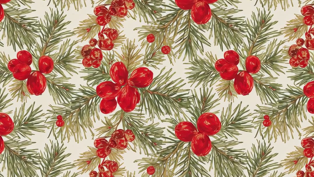 AI Generated Video. Single-frame video clip showing panning reveal of seamless hand-drawn pine needle and red berry pattern on cream paper. Composition featuring rich green evergreen sprigs and glossy red berry clusters arranged in repeating motif. Style blending vintage botanical illustration with modern flat print, providing warm holiday mood and natural texture. Ideal for holiday packaging, wrapping paper, greeting cards, seasonal website banners, social media video backgrounds, animated GIFs, textile print, wallpaper mockups, craft projects. Color palette suiting traditional Christmas scheme: forest green, crimson red, warm cream. Clip working well for looping video, product mockups, print-ready designs, motion graphics overlays. Recommended uses include brand holiday campaigns, e-commerce hero reels, DIY wrapping templates, printable stationery, fabric pattern sampling, seasonal marketing assets.