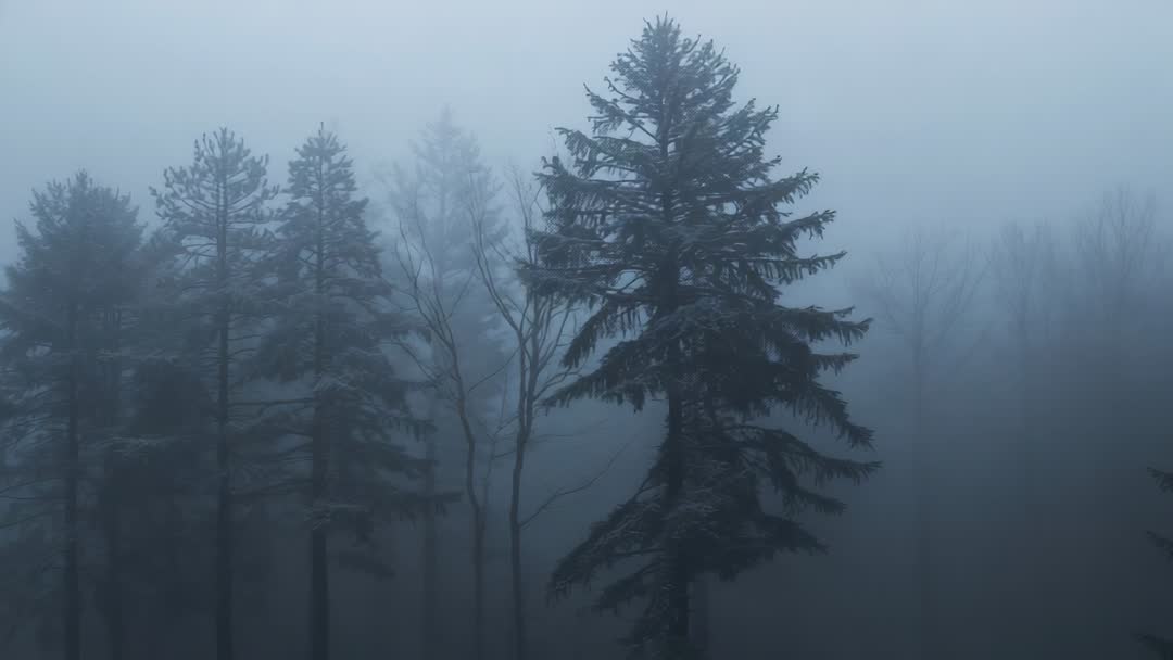 AI Generated Video. Panning shot showing mist-shrouded spruce forest with silhouetted evergreens and bare trunks. Featuring slow lateral camera movement revealing midground spruce with detailed branches, soft snow dusting, deep atmospheric fog, and muted blue tones. Evoking moody, cinematic atmosphere and quiet isolation. Working well for cinematic openers, nature documentaries, mystery or thriller trailers, background for title sequences, website hero banners, mindfulness and meditation apps, seasonal marketing for winter tourism, and editorial stories about forestry or climate. Suiting book covers, album art, social media posts, and atmospheric commercial spots. Recommending slow ambient music, desaturated color grading, and overlaying subtle text or logos for dramatic effect.