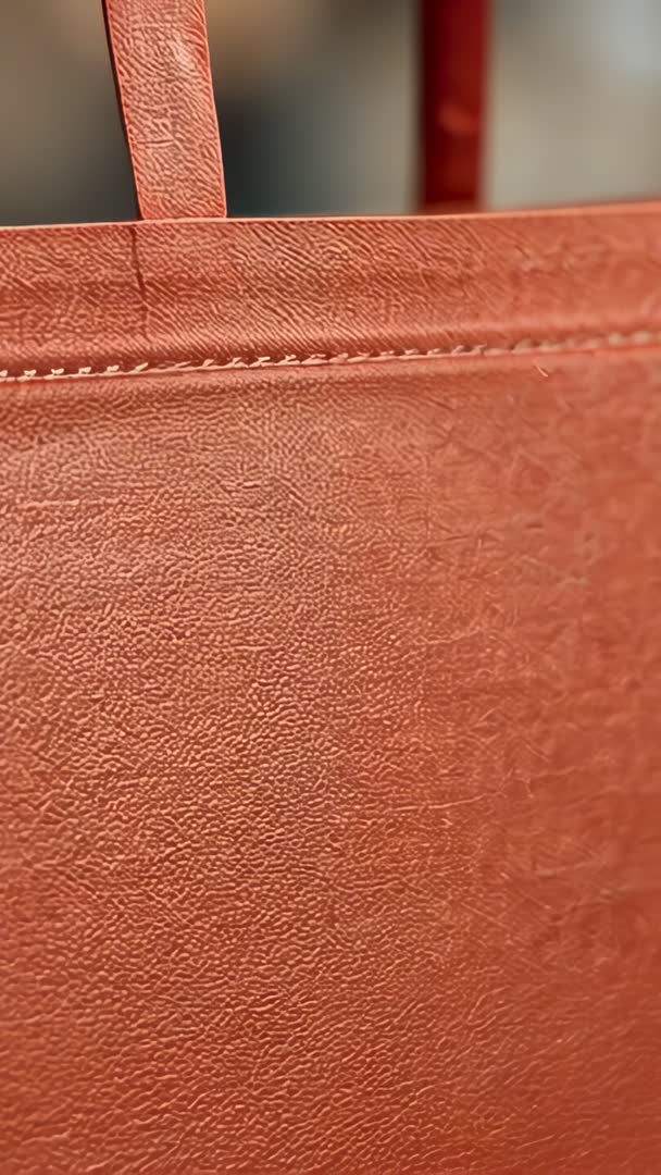 AI Generated Video. Vertical 9:16 footage panning across orange leather tote bag, revealing closeup details of strap seam, stitching and textured grain. Camera slowly moving upward to expose top edge and strap attachment while shallow depth of field softens background. Warm studio lighting accentuating leather color and surface detail. Ideal for ecommerce product pages, social media reels, Instagram Stories, TikTok ads, fashion campaigns, brand commercials, hero banners and retail display loops. Use for product showcase cutaways, texture highlight reels, lifestyle campaign inserts and website hero sections. Editing tips: loop-friendly 3–7 second clip, slow motion or smooth ramp for dramatic feel, subtle color grading to enhance orange tones, overlay minimal text on blurred upper area, pair with soft upbeat music or ambient sound. Delivering rich tactile detail for audience engagement and conversion-focused content.