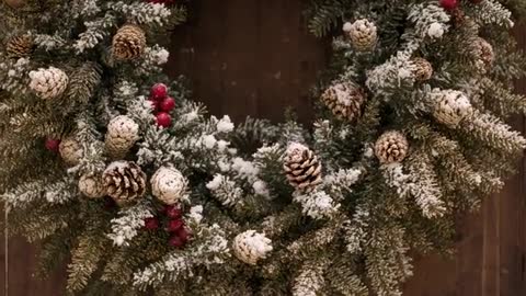 AI Generated Video. Showing slow panning sequence revealing frost-dusted pinecones and red berries nestled in evergreen wreath against rustic wooden plank. Camera movement emphasizing center of lower wreath, highlighting textured needles, snow dusting, and warm wood grain. Color palette blending deep greens, warm browns, and pops of red for cozy holiday mood. Clip working well for website hero banners, social media reels, seasonal ads, greeting card animations, product landing pages, store displays, and event promos. Suggesting gentle slow zoom or looping for ambient background, adding soft instrumental music and holiday text overlay for messaging. Ideal for rustic or traditional holiday campaigns, craft and home decor branding, floral design tutorials, and seasonal editorial content.