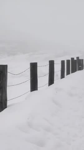 AI Generated Video. Vertical clip showing slow pan right along snow-packed two-wire fence posts disappearing into heavy fog, creating quiet, minimalist mood. Composition emphasizing weathered wooden posts, low-contrast snowdrifts, and muted overcast sky for subdued, cinematic tone. Footage working well for mobile-first projects and social vertical formats such as Reels, TikTok, and Stories, plus cinematic intros, title sequences, and background loops. Use for travel and weather segments, winter product advertising, editorial storytelling, or mood-driven social posts. Recommend pairing with ambient wind sounds or sparse piano, applying subtle desaturation and soft contrast to preserve delicate highlights. Clip offering ample negative space for overlaying text, logos, or captions and supporting slow, contemplative edits.