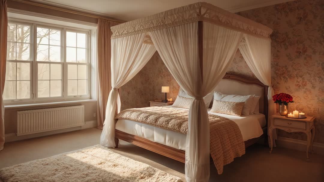 AI Generated Image. Showing four-poster bed with sheer canopy and draped curtains, camera panning right and zooming in to frame candle arrangement on bedside table. Capturing warm golden-hour sunlight streaming through tall window, soft shadows, and textured floral wallpaper for vintage romantic mood. Highlighting plush bedding, decorative pillows, bedside lamp, and vase of red roses beside flickering candles for intimate relaxing atmosphere. Providing versatile B-roll clip for interior design promos, hotel and boutique marketing, romantic lifestyle content, relaxation and sleep wellness videos, product ads for bedding or candles, social media reels, and TV or film atmospheric sequences. Recommended usage: pairing with slow ambient music, applying warm color grade, using gentle crossfade transitions, and cropping for 16:9 or vertical formats for social reels. Suitable for background use, hero cutaway, intro sequence, or product showcase.