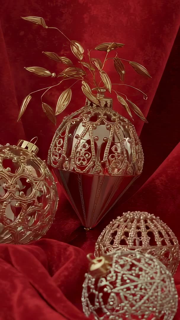 AI Generated Image. Vertical footage panning right, revealing ornate silver ornament resting on rich red velvet and highlighting intricate metalwork. Shot focusing on reflective surfaces, filigree details, and tactile velvet folds, creating luxurious festive mood. Footage suiting holiday commercial, luxury brand campaign, social media reel, product showcase, seasonal greeting video, packaging reveal, or editorial background. Editing options including slow dissolve, cinematic color grade, tight crop, or close-up reveal to emphasize craftsmanship. Vertical format ideal for mobile reels, stories, and portrait displays, and for craft tutorial or behind-the-scenes content.