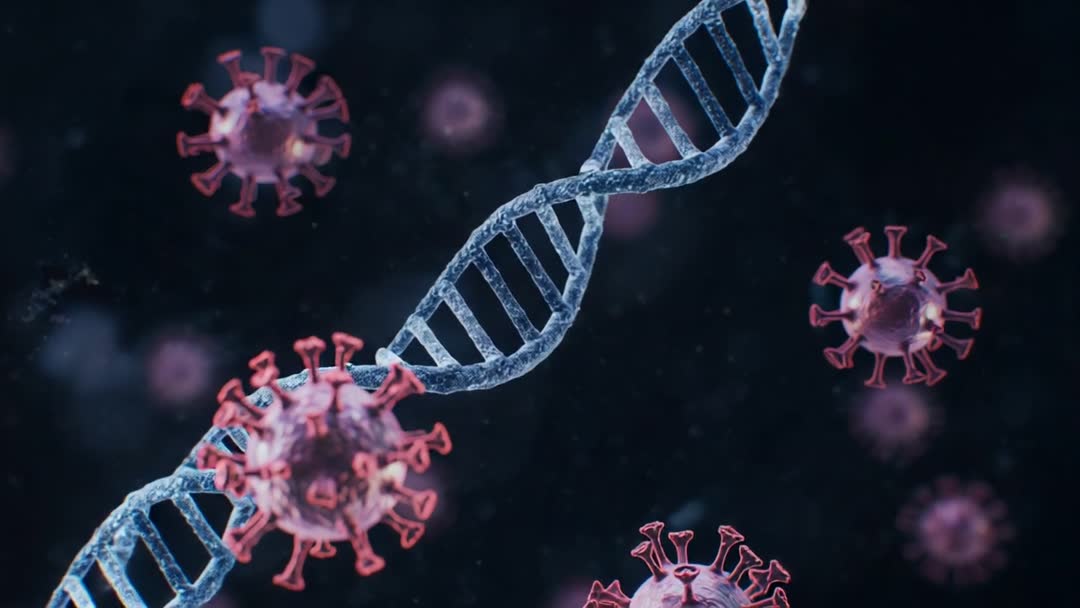 AI Generated Image. Showing rotating blue DNA double helix at nanoscale while pink coronavirus spheres drifting across dark background. Camera panning delivering cinematic movement and shallow depth of field for dramatic focus. Suitable for science communication, virology news, pandemic explainer, vaccine research presentation, biotech startup pitch, medical documentary, online course, social media clip, website hero, conference opener. Offering seamless loop and high-resolution frames for broadcast, digital ad, slideshow, educational animation, corporate report. Color palette and motion emphasizing contrast between genetic material and viral particles for clear visual metaphor. Including AI generated rendering note for editorial and creative projects.