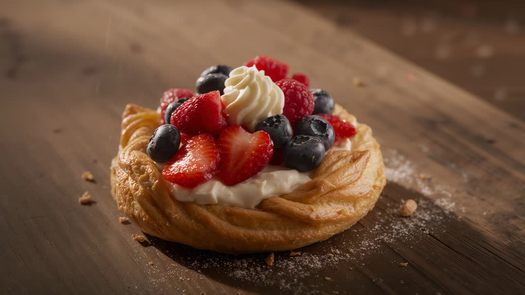 AI Generated Image. Close-up clip panning across rustic berry Danish pastry on dark wooden table. Puffed golden-brown pastry holding pillowy piped cream, topped with halved strawberries, whole blueberries, raspberries and small whipped cream rosette. Camera refocusing on cream swirl while crumbs and powdered sugar adding tactile detail. Warm, moody lighting creating cozy, artisanal mood and highlighting flaky layers and glossy fruit. Useful for recipe videos, bakery promotional clips, social media food reels, cooking tutorials, menu headers, lifestyle commercials and packaging visuals. Editorial options include focus-on-text overlays for recipe steps, looping short clips for Instagram Reels and TikTok, slow-motion reveal for hero sequences, close-up transitions within culinary shows. Color grading suggestions: warm vignette and slightly desaturated background to emphasize fruit. Stock footage notes: works as mid-length B-roll or hero shot for brand storytelling and product advertising.