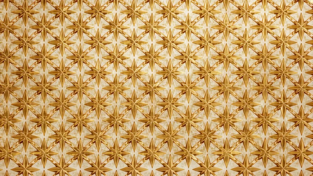 AI Generated Image. Panning camera moving across gilded octagram star relief on ornate interior panel, centering rows and revealing embossed depth and warm highlights. Repeating geometric motif and rich gold tones creating luxurious, tactile visual ideal for background footage or motion design elements. Clip working well for luxury brand promos, hotel lobby visuals, museum exhibit trailers, architecture reels, title sequences and product showcases. Footage offering smooth loop potential for continuous backgrounds, supporting slow-motion, parallax and compositing workflows. Color grading and crop-friendly framing enabling adaptation to widescreen, social and web formats.