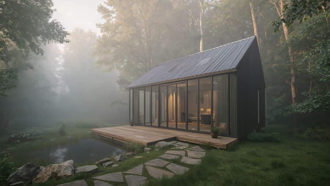 AI Generated Video. Video showing panning move closing on modern glass cabin nestled in misty forest. Wooden deck extending over tranquil pond reflecting soft morning light. Interior glowing with warm lamp light, creating cozy contrast against cool fog. Camera movement linking inside and outside, highlighting floor-to-ceiling windows, minimal furnishings, and clean architectural lines. Atmosphere evoking peaceful retreat, slow living, solitude, and reconnection with nature. Usage ideas: Use for architecture reels, real estate promos, travel commercials, wellness and meditation apps, sustainable design portfolios, social media hero clips, website banners, and background loops for lobbies and events. Suitable for editorial features about tiny houses, off-grid living, cabin design, and nature retreats. Recommended color grading: cool greens with warm interior highlights to emphasize contrast. Suggested edit styles: slow dissolve, subtle crossfade, or gentle speed ramp for cinematic feel. Consider adding soft ambient soundtrack or nature sounds for immersive effect.