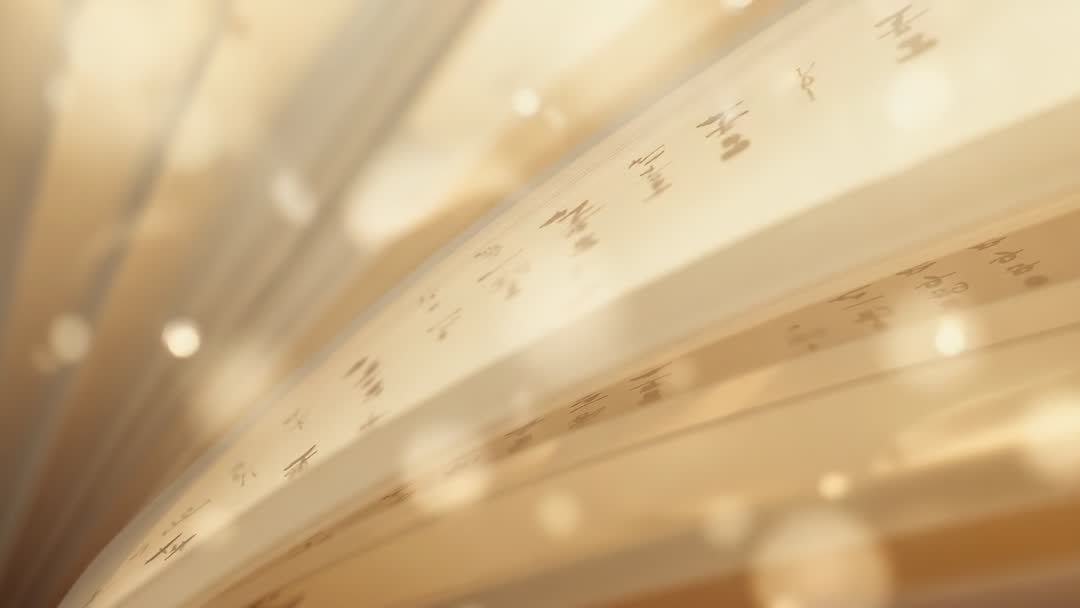- Panning shot revealing curved manuscript pages with flowing calligraphy and warm bokeh