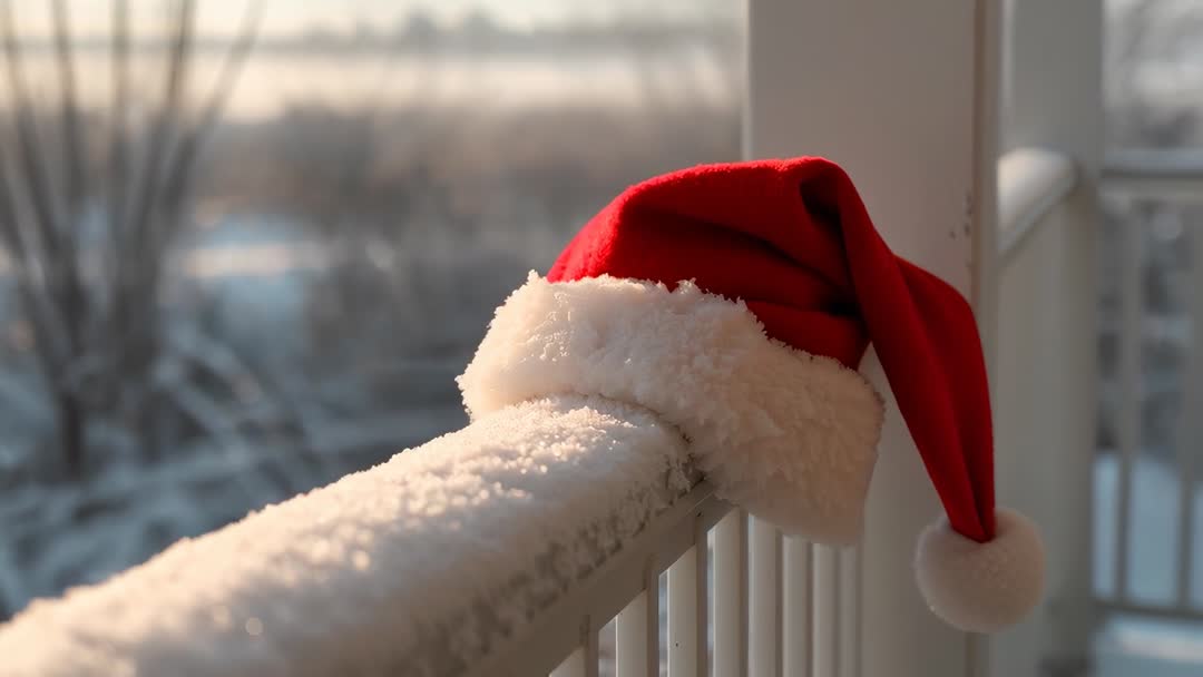 - Panning shot revealing red Santa hat resting on snowy balcony railing at sunrise with soft bokeh