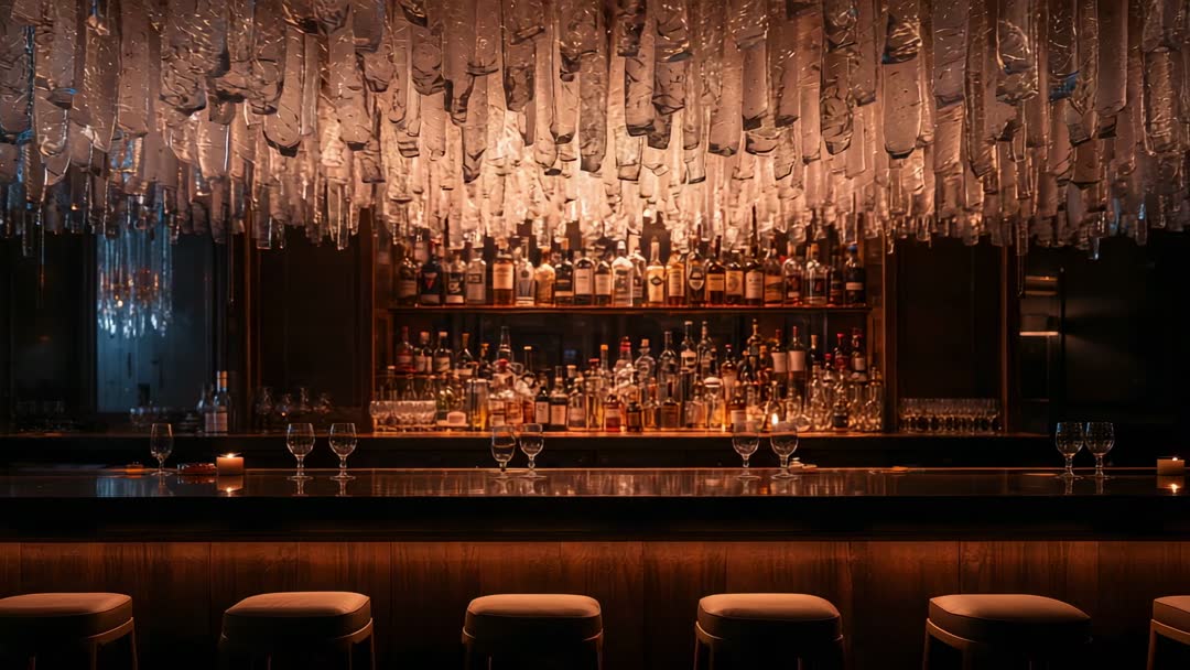 AI Generated Image. Revealing panning slow-motion footage of luxury bar counter with chandelier and glassware reflecting warm amber glow. Showcasing rows of backlit bottles and polished bartop, creating intimate, cinematic mood. Featuring empty stools and candlelight for elegant, upscale atmosphere. Ideal for use in hospitality promos, hotel and restaurant marketing, cocktail lounge social media reels, nightlife and event promos, opening sequences for films and TV, background footage for websites and digital signage. Serving as b-roll for bartending tutorials, cocktail recipe videos, and luxury brand commercials. Easy to loop for hero backgrounds and lower-third overlays. Recommending 5–15 second loops with subtle color grade toward warm tones. Delivering high-end, moody visuals for branded content and promotional campaigns.