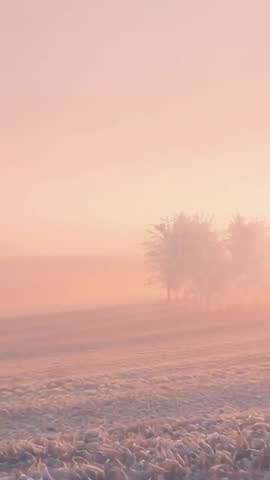 - Panning sunrise over frosty field into misty tree grove with soft pastel dawn light, vertical video