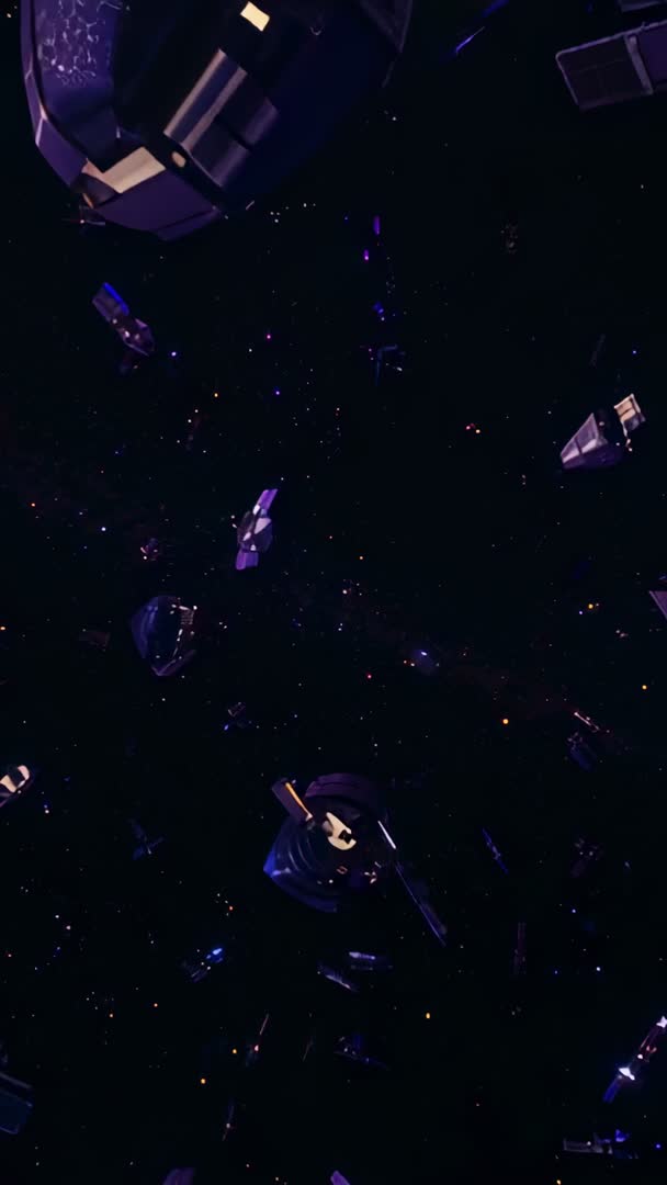 AI Generated Image. Vertical sci-fi video showing panning camera revealing mid sized capsule drifting through field of derelict satellites and fragments. Capsule featuring yellow robotic arm rotating slowly while surrounding modules and panels tumbling against dense starfield and glowing nebula. Mood leaning toward mysterious and cinematic with deep purple and blue tones and scattered orange sparks. Useful for title sequences, cinematic trailers, VFX plates, educational videos about orbital debris and cleanup, tech product promos, mobile app backgrounds, social media vertical ads, museum exhibits, and science presentations. Clip working well as loopable background or layered element for composite shots. Suggest slow grade adjustments and subtle camera push to enhance depth and scale.