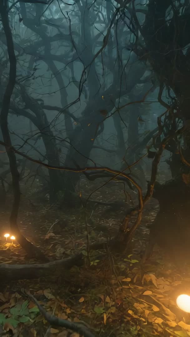 AI Generated Image. Panning camera moving from glowing mushrooms on forest floor toward gnarled tree shrouded in blue fog, creating moody contrast between warm bioluminescent light and cool shadows. Twisted branches forming intricate silhouettes while fallen leaves covering ground, adding texture and depth. Providing vertical framing for mobile platforms and social video, offering slow cinematic motion for tension building or dreamlike atmosphere. Ideal for horror trailers, fantasy intros, game background loops, TikTok and YouTube Shorts, Halloween promos, book covers, ambient music visuals, nature storytelling. Editing suggestions: adding deep low-end sound design, layering subtle particle fog, color grading for teal and orange contrast, overlaying bold text for title cards. Delivering ready-to-use vertical clip for creative projects requiring eerie, mystical woodland mood.