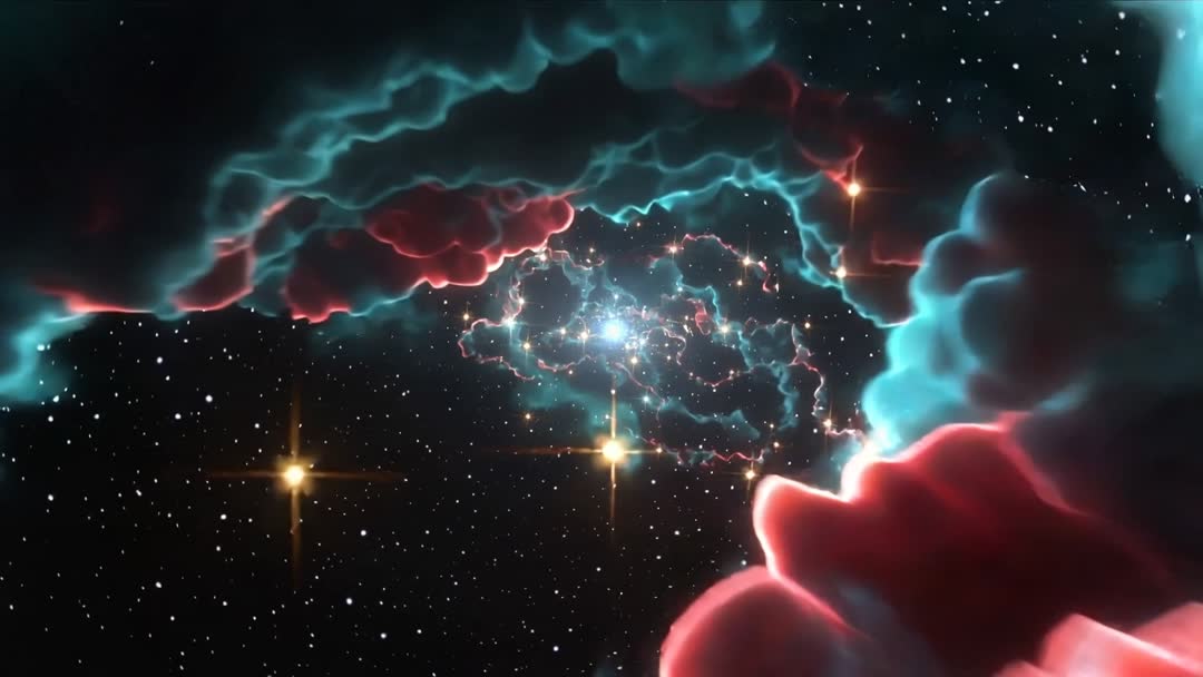 - Panning through teal-pink nebula filaments toward glowing stellar core with spiked lensflare stars
