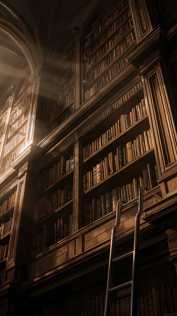 AI Generated Video. Vertical video showing slow tilt upward past towering ornate wooden shelves, revealing rolling ladder and arched window bathing space in warm golden sunbeams and visible dust motes. Camera movement providing cinematic reveal of high book stacks, carved timber details, and ladder track, creating sense of history and quiet discovery. Lighting casting soft rays and subtle lens flare, enhancing atmospheric nostalgic mood. Use for library promotion, bookstore commercial, educational series opener, historical documentary opener, university or museum marketing, social media vertical reel, smartphone wallpaper, ambient video loop, interior design portfolio, or cinematic establishing shot. Pair with soft piano, airy ambient soundscape, or voiceover narration about literature, study, or heritage. Include subtitle area in lower third for title or call to action.