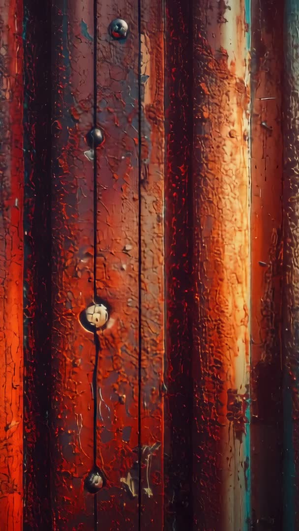AI Generated Image. Starting with camera panning upward over rusted container, revealing rivets, flaking paint, and textured metal panels. Showing strong contrast of warm orange highlights and deep brown shadows, creating dramatic, tactile mood. Serving as background for titles, lower thirds, or video transitions and as texture overlay for motion graphics and VFX. Working well for social vertical platforms like Instagram Reels, TikTok, Stories, and mobile ads thanks to tall framing and close-up detail. Suitable for editorial visuals on industrial topics, urban decay stories, restoration or recycling campaigns, and product backdrops for metalwork or vintage branding. Recommend applying subtle color grade and slow motion to emphasize texture and rivet detail, and using seamless loop or slow pan edits for ambient film or promotional sequences.
