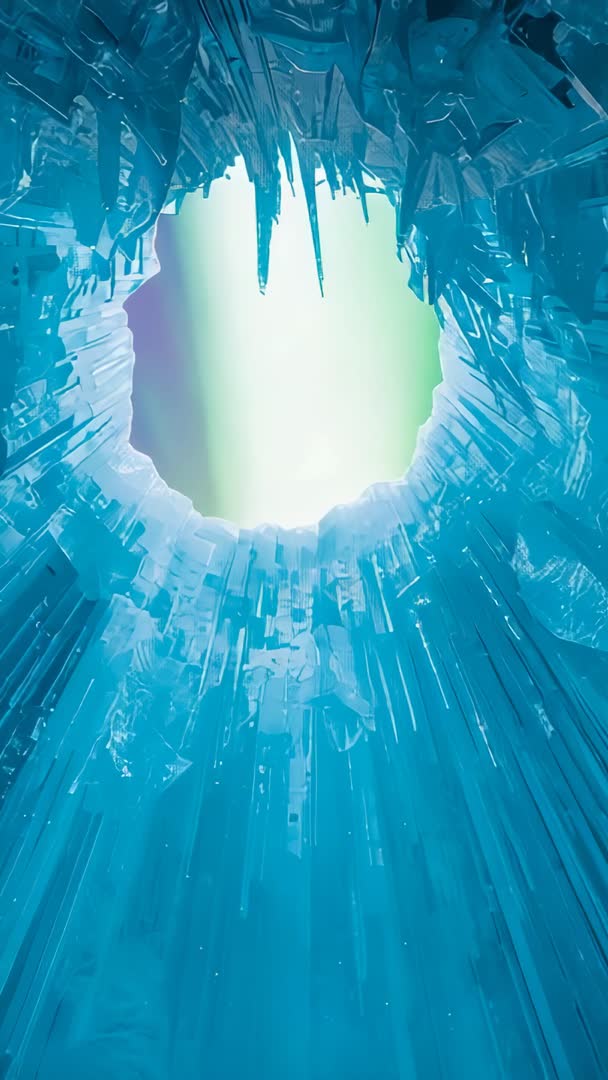 AI Generated Video. Vertical video showing camera panning upward inside crystalline ice shaft, revealing circular skylight glowing with green aurora. Serving mobile vertical ads, social media stories, app backgrounds, cinematic openers, and nature documentaries. Providing dramatic backdrop for winter travel campaigns, climate awareness projects, relaxation and meditation content, and music video intros. Recording in vertical format, optimized for 9:16 displays, looping-friendly for ambient visuals. Featuring cyan and emerald tones, high-contrast crystalline textures enhancing slow-motion edits and title overlays. Offering clean negative space near skylight for logo placement, lower third graphics, or text animations.